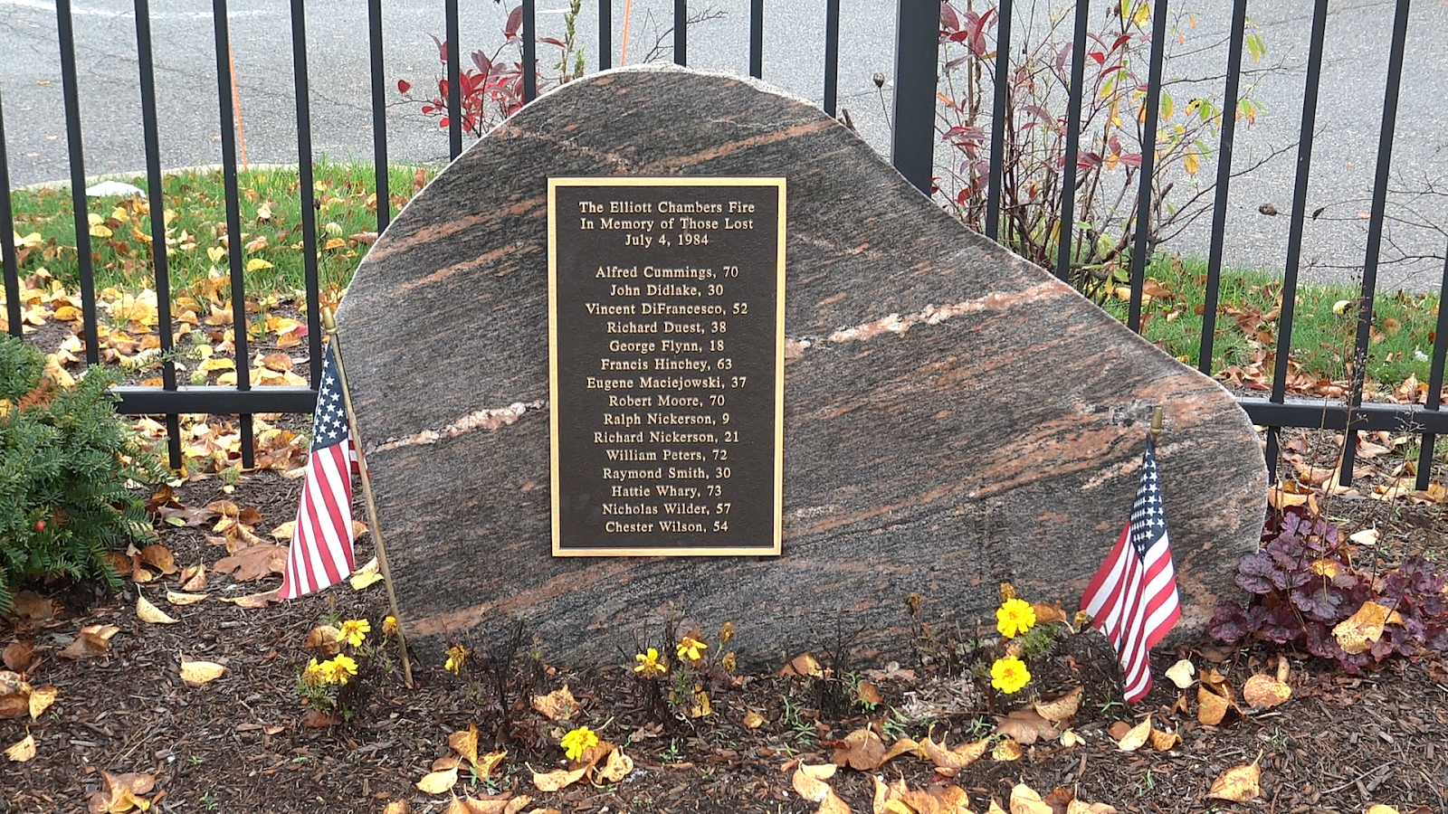 A modest hunk of polished granite rests between two benches. Affixed to it is a bronze plaque engraved with the names and ages of the 15 people who were killed by the fire. The monument was donated by the Elliott Chambers Fire Memorial Foundation in 2010.