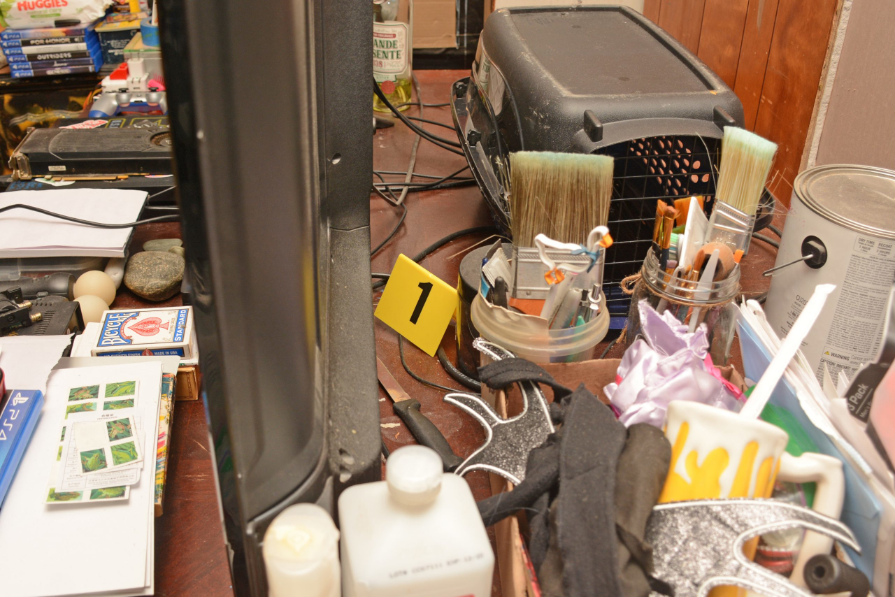 A photograph released by Quinn’s office shows a steak knife behind a TV on a cluttered desk across the room from where Harden was shot.