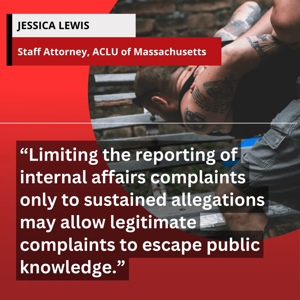 Reminding the Commission that the statute that created it called for the collection of data on “any internal affairs complaint,” Jessica Lewis, an attorney with the ACLU of Massachusetts, wrote in December 2022, “Limiting the reporting of internal affairs complaints only to sustained allegations may allow legitimate complaints to escape public knowledge.