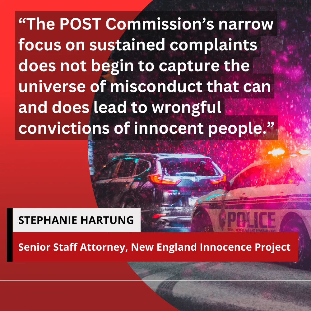 “The POST Commission’s narrow focus on sustained complaints does not begin to capture the universe of misconduct that can and does lead to wrongful convictions of innocent people,” said Stephanie Hartung, a senior staff attorney for the New England Innocence Project. She said that when past misconduct is uncovered in the course of an exoneration investigation, “there is rarely, if ever, an underlying ‘sustained’ finding by the police department.”