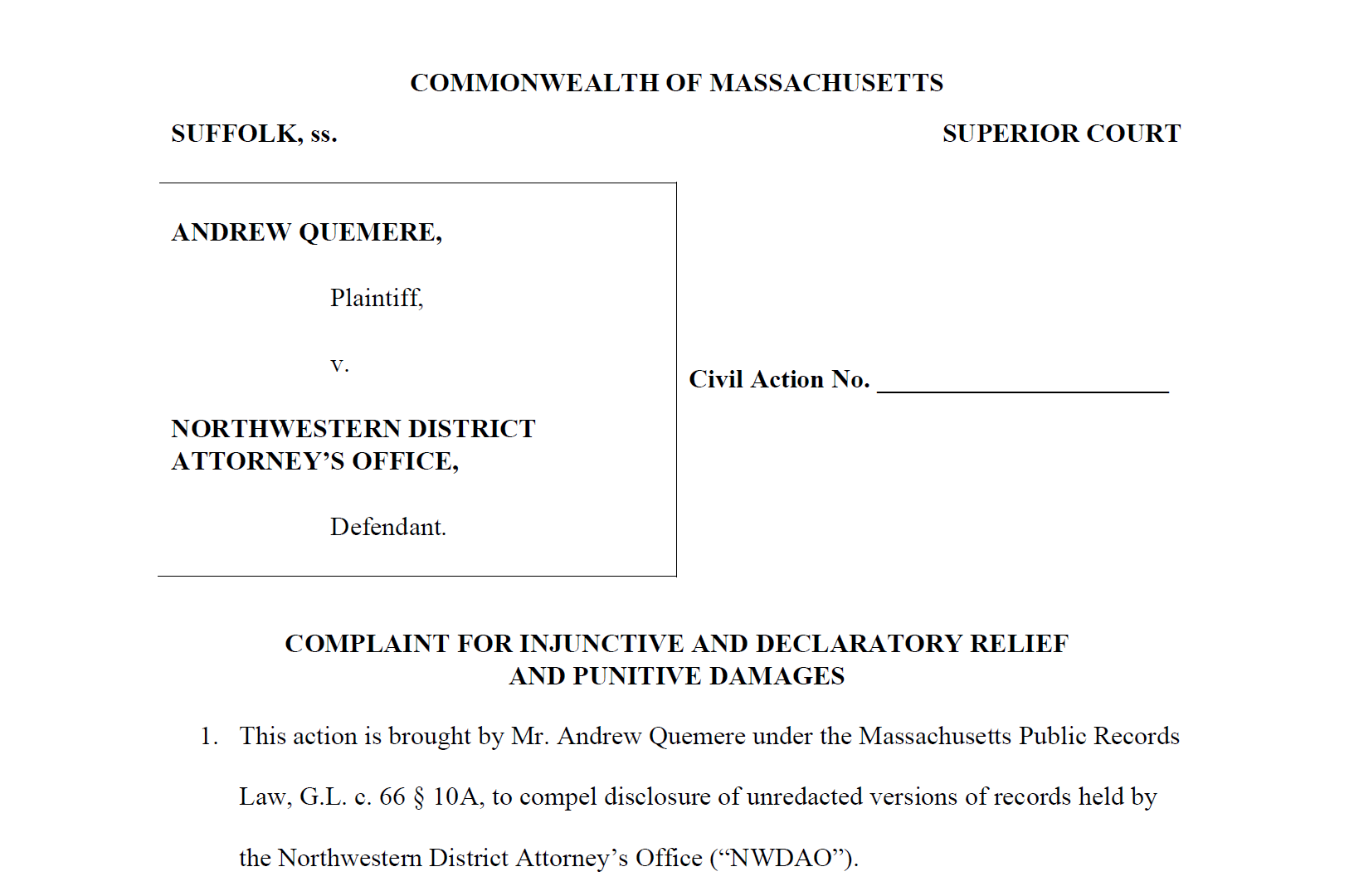 Quemere said the lawsuit is the result of a broken public records system in Massachusetts, where state records officials don’t have the power to hold government officials who refuse to turn over records accountable. Public records lawsuits consume taxpayer resources, and are unnecessarily burdensome for members of the public seeking records about government operations, he said.