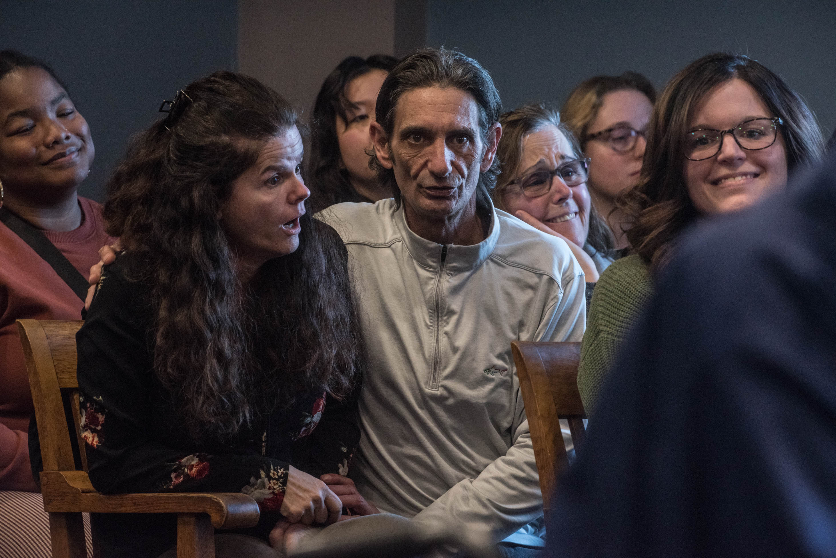 Verzi smiled, and her husband took her left hand. Seated behind them, Carver’s ex-wife, Dempsey, looked down in shock, covering her mouth as her boyfriend held her. Dempsey looked up at her daughter, who smiled back. Verzi reached her free arm behind her and held hands with her mother, who began taking deep breaths. Bill Carver’s eyes began to well up. He took a sip of water, removed his glasses, and wiped away his tears at almost the exact moment as his brother.