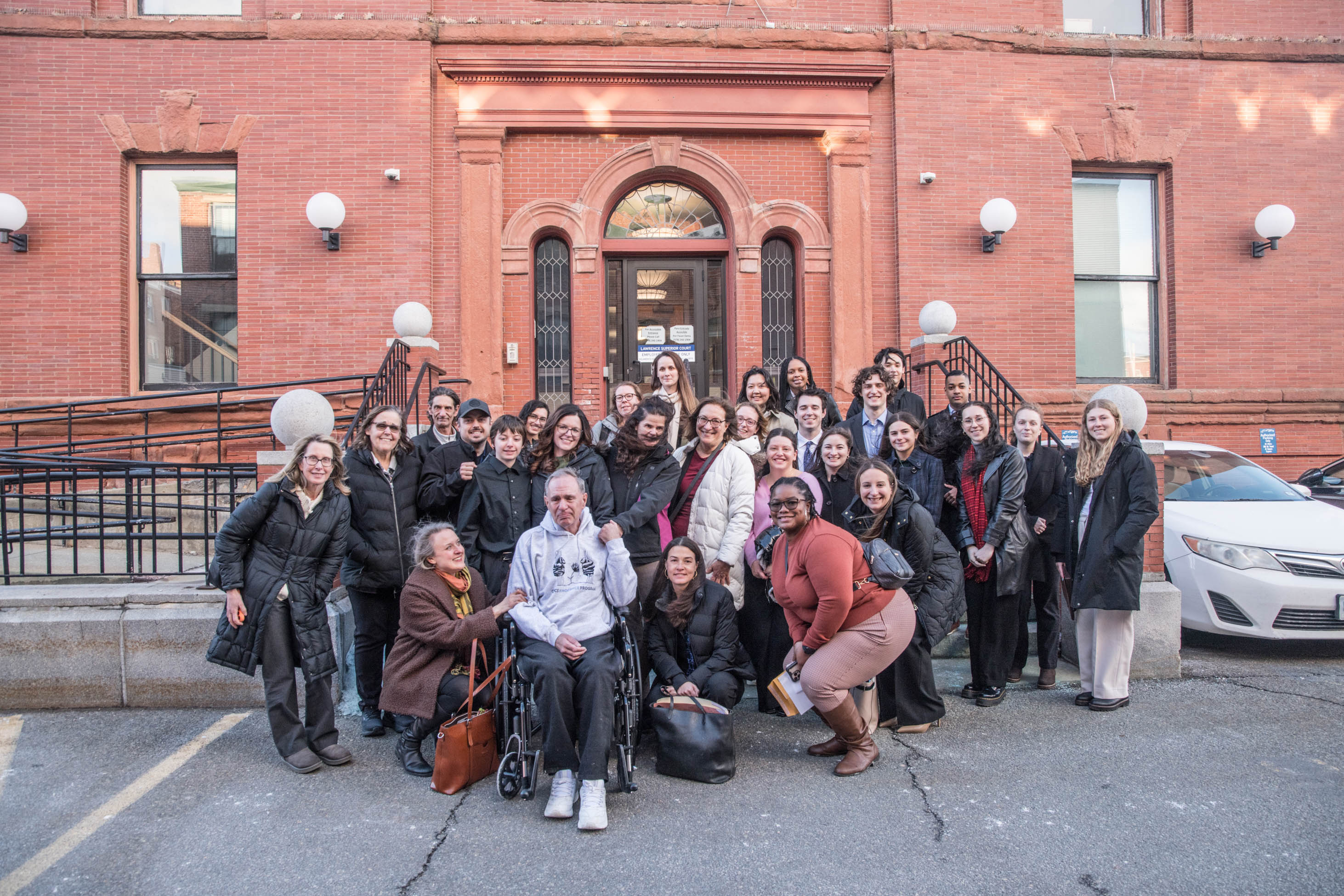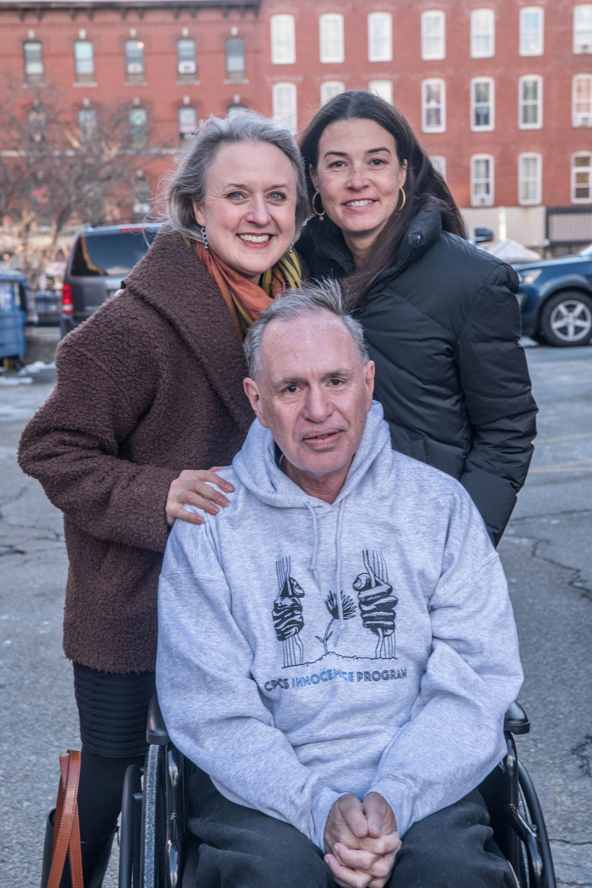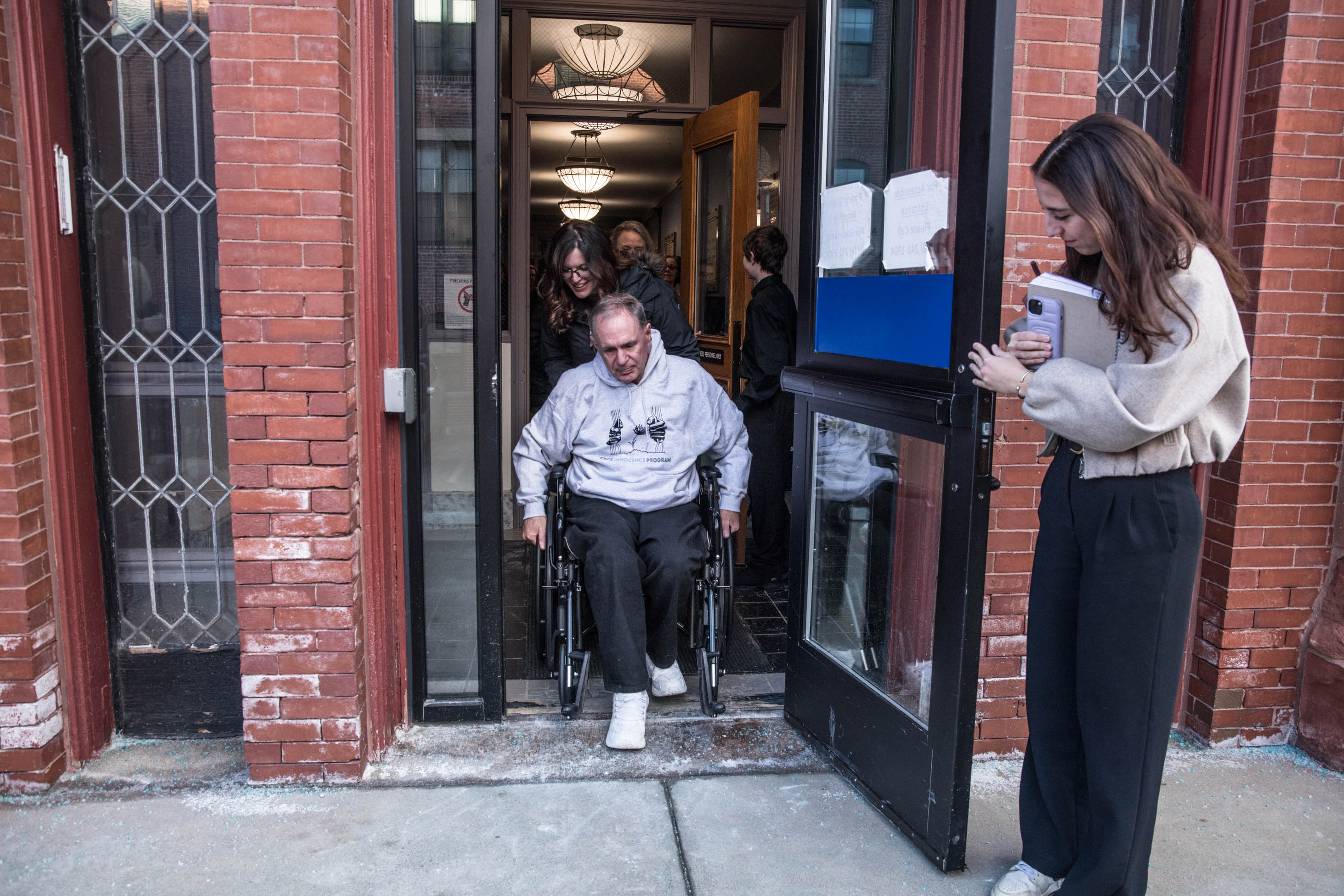 At 3:58 PM, Carver emerged from the elevator on the first floor. His lawyers and relatives joined him, with his daughter pushing his wheelchair. Now wearing a gray hooded sweatshirt with the logo for the CPCS Innocence Program, he smiled. The other supporters, who had lined up in the hallway, clapped for him. He kissed one of them on the cheek, shook hands with others, and shared a long hug with his ex-wife, Dempsey. And then Verzi wheeled her father through the doorway to freedom.