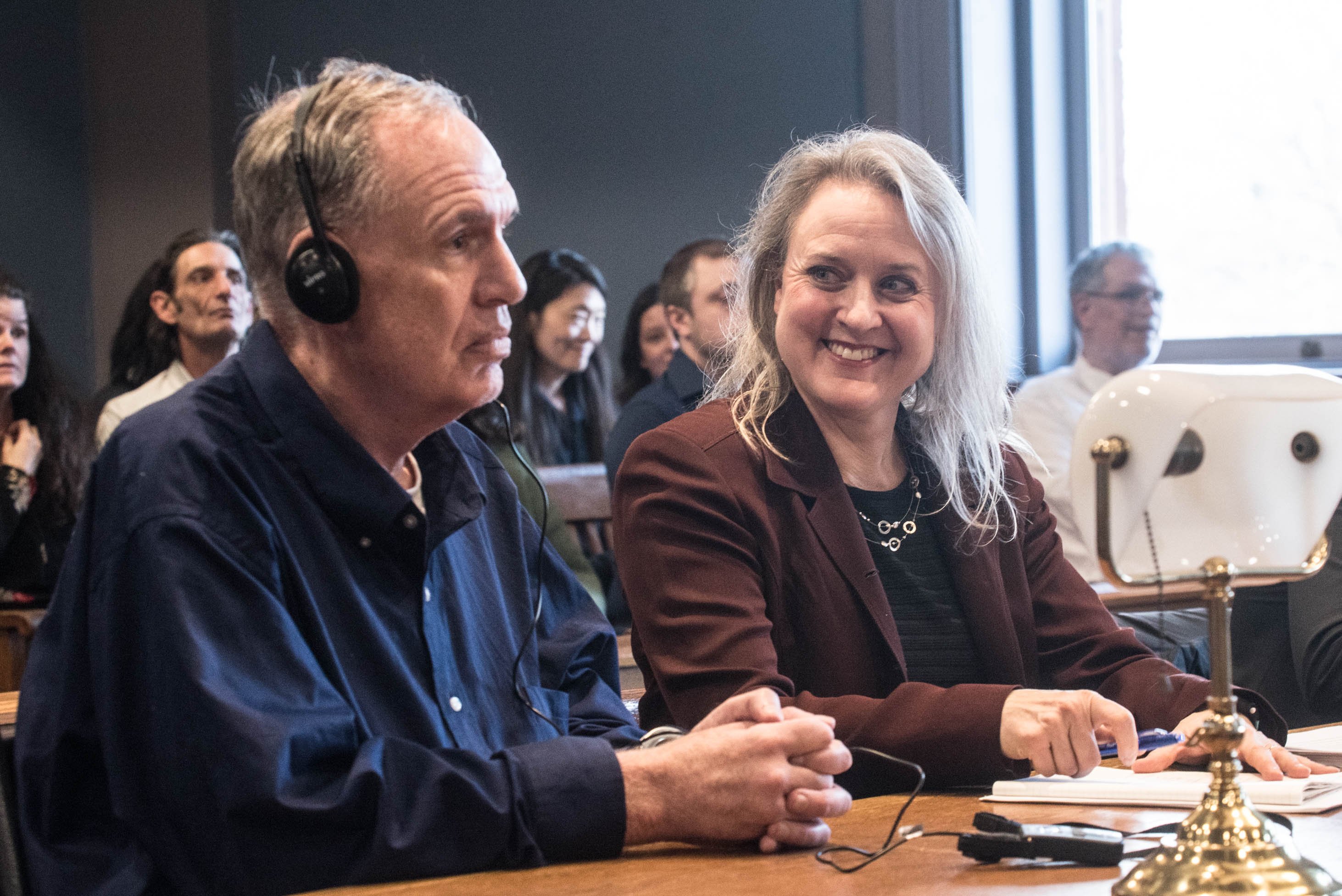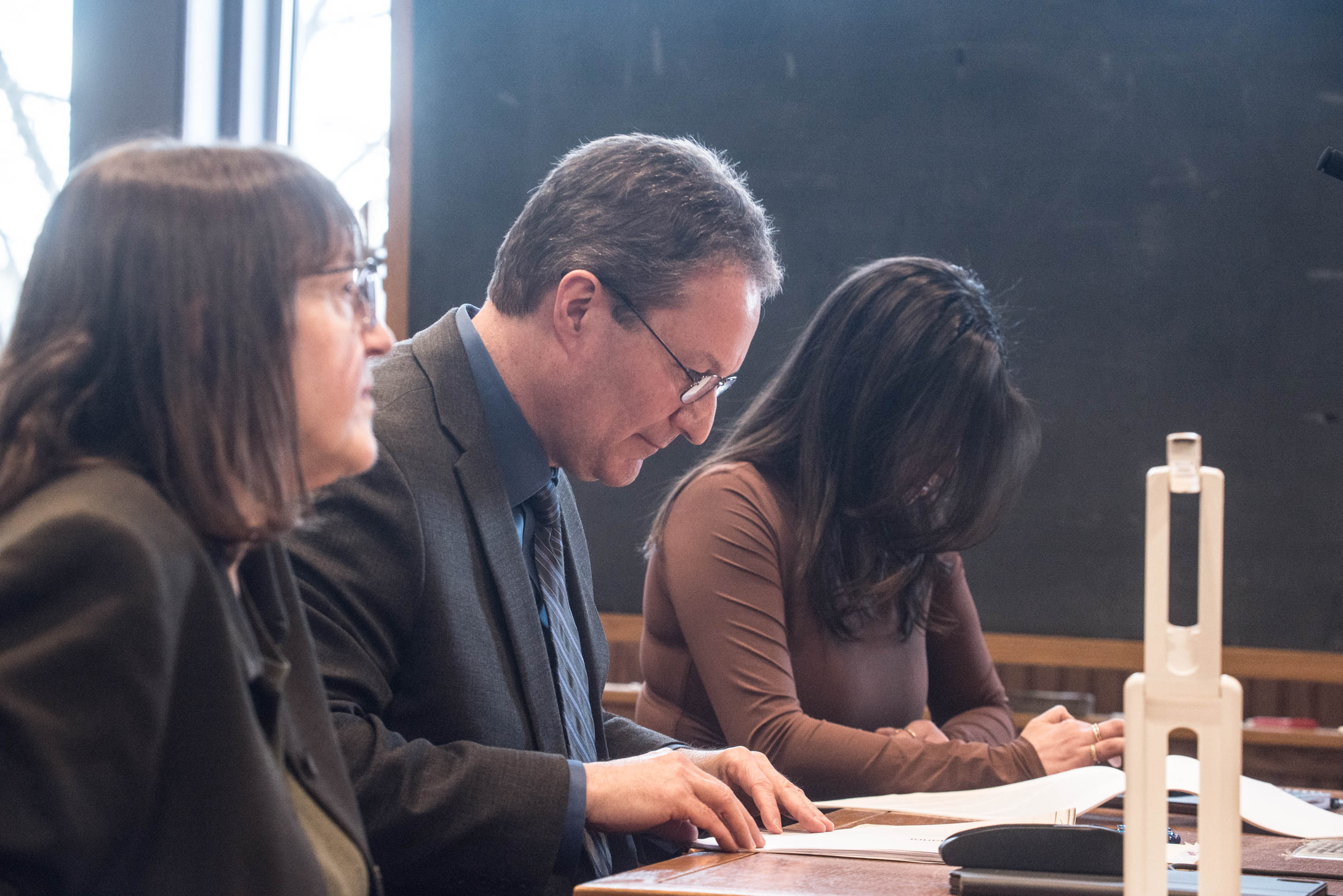 Kavanaugh and Whitmore immediately turned to face Carver and smiled. Kavanaugh placed her hand on Carver’s back. Carver stared straight ahead for a moment, quivering slightly, and pressed his lips together. He looked over at Kavanaugh, who nodded at him. He turned his head forward and took a breath. Not long after, tears filled his eyes.