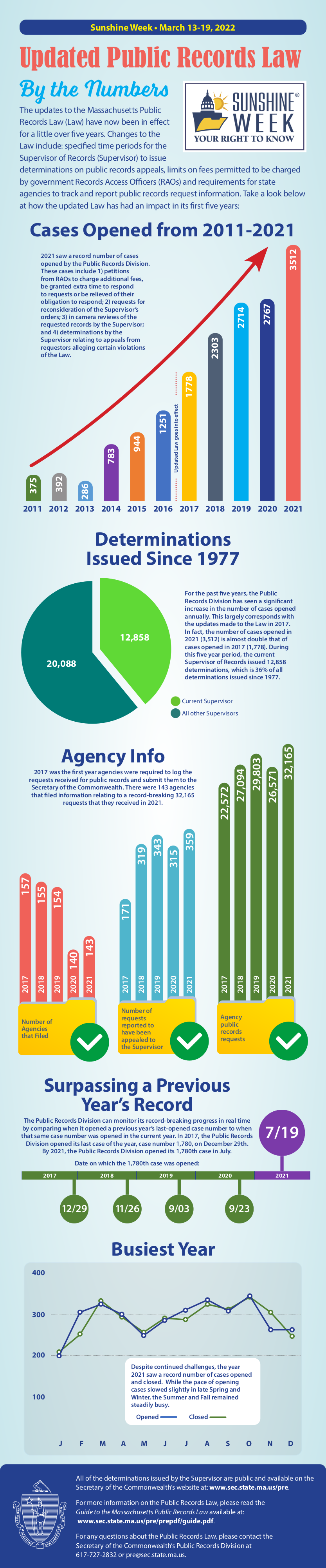UPDATE/CORRECTION (5/23/2022): Apparently I was wrong about the comptroller’s office being the only government agency to participate in Sunshine Week. The secretary of the commonwealth’s office has been publishing a Sunshine Week infographic every year since 2017, when Rebecca Murray took over as supervisor of public records.